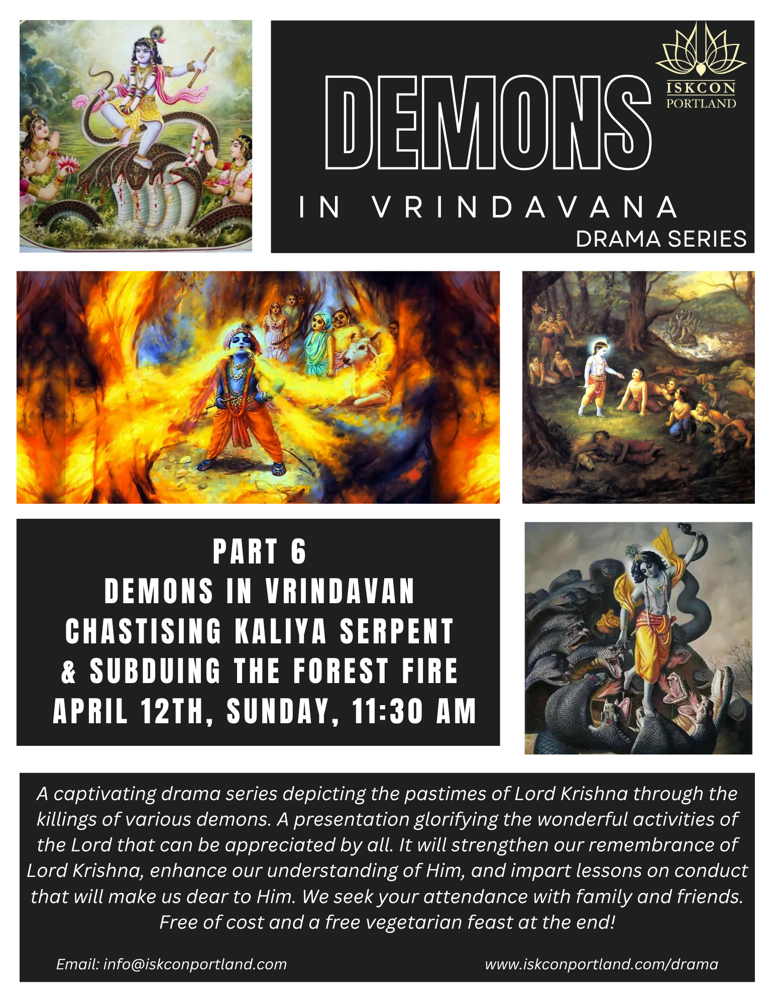 A captivating drama series depicting the pastimes of Lord Krishna through the killings of various demons. A presentation glorifying the wonderful activities of the Lord that can be appreciated by all. It will strengthen our remembrance of Lord Krishna, enhance our understanding of Him, and impart lessons on conduct that will make us dear to Him. We seek your attendance with family and friends. Free of cost and a free vegetarian feast at the end!